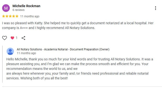 We needed to have a multi-page document notarized in a timely manner. Unfortunately our bank doesn’t provide multi-page notary services, so we were in a bind trying to find a notary in our area that understood multi-page mortgage documents. Thankfully, Ketty Busquets with All Notary Solutions did! We walked in without an appointment and were greeted warmly. She carefully reviewed the documents, explained black vs blue ink signature consequences and notarized everything in a timely manner.