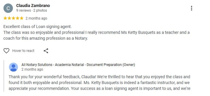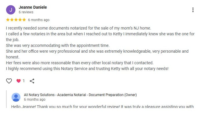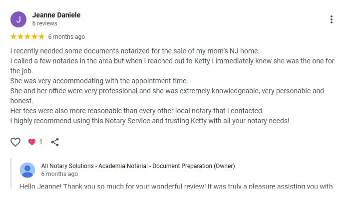 I would give Ketty and her business 100 stars if I could. She is professional, courteous, thorough, and reasonably priced. She helped me after Hurricane Ian with my 91 year old mother with documents we needed signing and sending cross coutry. I can tell she just loves her work by her demeanor and attention to everything.