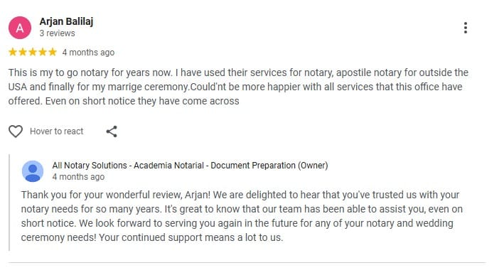 I can happily say that I finally found the right place, the right Notary in town. This office are outmost professional with service, attention and price. I highly, highly recommend them for notarial services including document authentication and Apostille.
